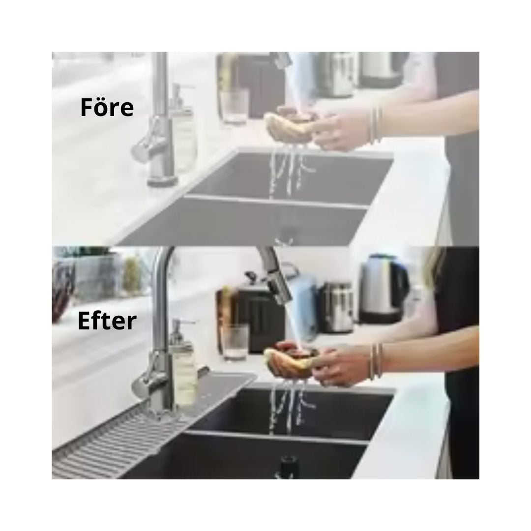 Varje gång du använder kranen rinner vatten ut på bänken. Det blir blöta fläckar, kalkringar, smuts och diskmedelsflaskor som står i en pöl. Du torkar, torkar och torkar – men nästa person vid kranen gör den blöt igen.